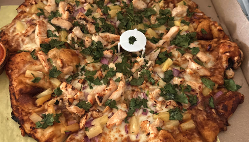 Padang peanut sauce, mozzarella cheese, chicken, red onion, pineapple, cashews, and cold cilantro